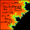 Description: "You can change the world in a tiny way" with the Mandelbrot set in the background